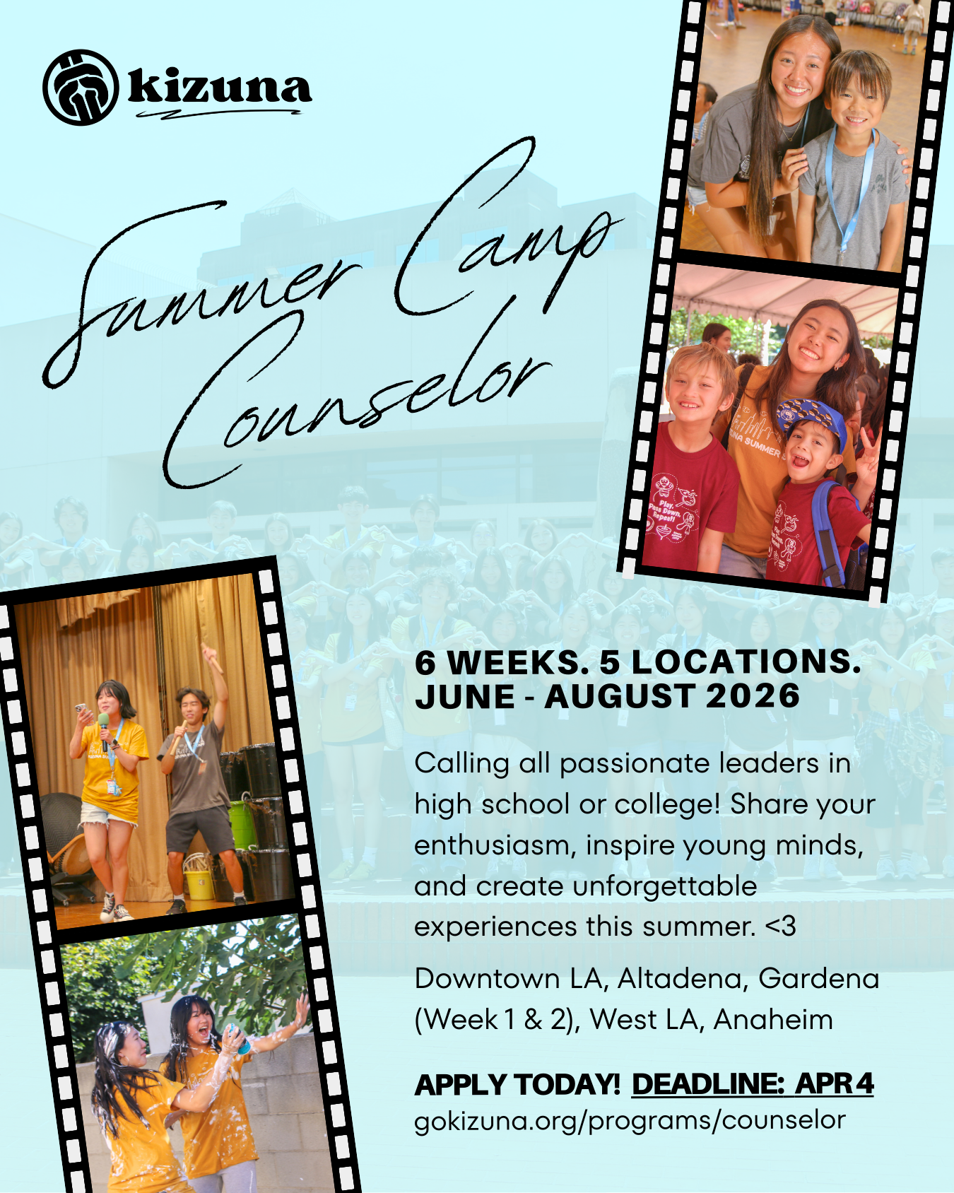 Junior Counselor spots have all filled up and waitlists are currently being implemented for all locations. We still encourage junior counselors to complete the application to be considered from the waitlist!